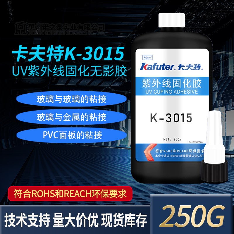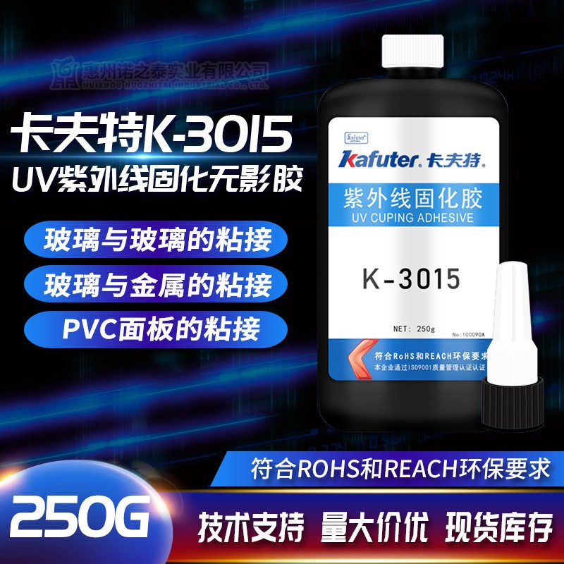 K-3015(玻璃/玻璃、玻璃/金屬黏結(jié)UV 膠)是一種紫外光及可見光固化的改性丙烯酸酯膠粘劑,柔韌性好、抗沖擊力強(qiáng)、粘接強(qiáng)度高。用于玻璃與玻璃、玻璃與金屬的粘接。